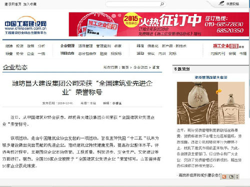 濰坊昌大建設(shè)集團榮獲“全國建筑業(yè)先進企業(yè)”榮譽稱號——中國工程建設(shè)網(wǎng)“企業(yè)動態(tài)”2