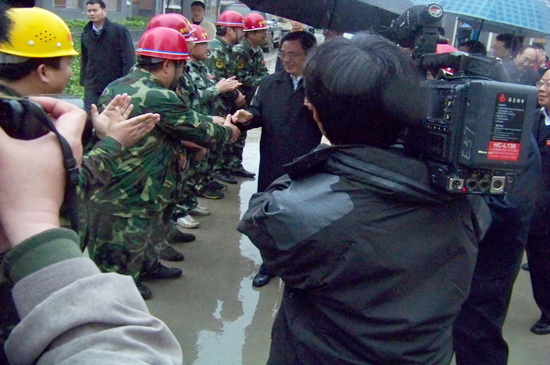 4月13日下午,春雨綿綿,中共中央政治局常委、中央紀律檢查委員會書記賀國強在有關人員陪同下,冒雨視察了北川新縣城援建工作。在集團公司援建的溫泉一期安居房工程現(xiàn)場,賀國強走進住宅樓實地察看已經(jīng)建好的新居,非常高興,對山東省濰坊市援建的安居房工程給予很高的評價,贊揚山東省濰坊市的援建隊伍是一支能打硬仗的施工隊伍,他感謝在援建工作中作出辛苦努力的所有援建人員,并預祝圓滿完成援建任務。
