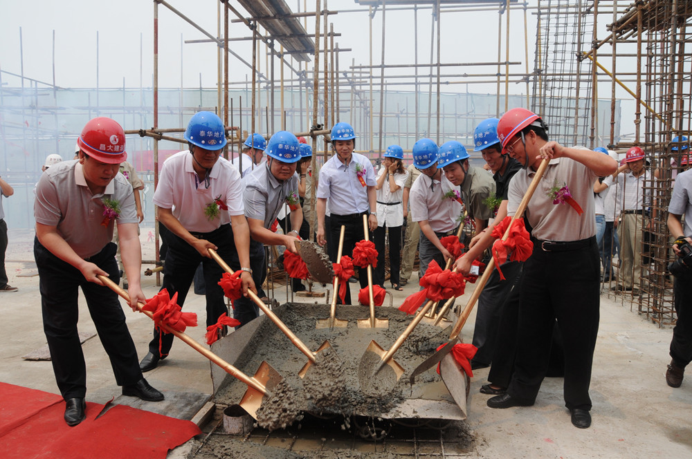 上圖為徐鵬強(qiáng)董事長、朱九洲總經(jīng)理與泰華董事長劉云江、監(jiān)理公司董事長曹金采等在封頂