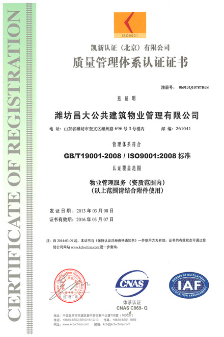近日,集團公管公司(濰坊昌大公共建筑物業(yè)管理有限公司)通過ISO9001質量管理認證。ISO9001質量管理認證的取得和實施,對于公管公司提高物業(yè)管理水平,擴大企業(yè)知名度,增強企業(yè)競爭力都有約束和推動作用。