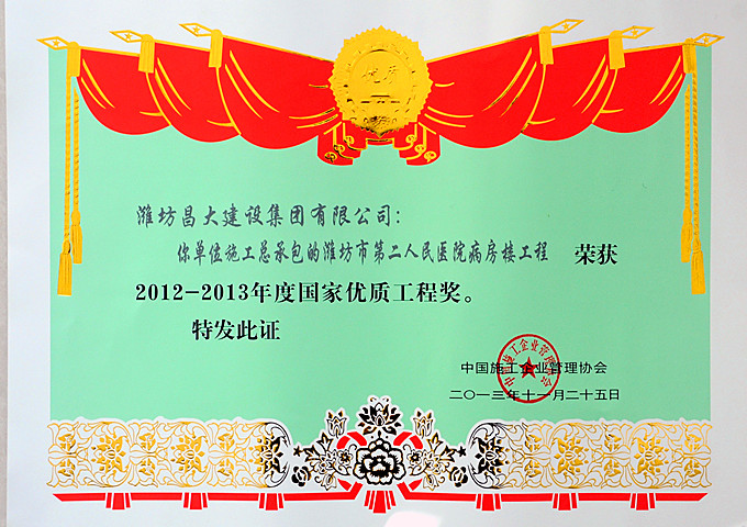 2013年12月27日,中國施工企業(yè)管理協(xié)會在北京召開“2012-2013年度國家優(yōu)質工程獎”表彰大會,為獲獎者頒獎。由集團第一分公司施工的濰坊市第二人民醫(yī)院病房樓工程獲此殊榮。 國家優(yōu)質工程獎是我國工程建設質量方面跨行業(yè)、跨專業(yè)的國家級榮譽獎勵,已經(jīng)成為政府提倡、社會知名、企業(yè)向往、專家認可、實踐過硬的著名品牌,以其權威性、規(guī)范性、指導性、示范性在工程建設領域享有崇高的聲譽。