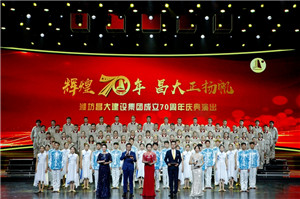 櫛風沐雨砥礪行,春華秋實滿庭芳。2019年10月16日晚,慶祝集團70華誕文藝晚會在濰坊文化藝術中心大劇院隆重上演。 集團高管層領導徐鵬強、朱九洲、穆乃杰、姜建魯、閆鵬、房海、劉雁冰、張學智、吳杰出席。黨委書記、董事長徐鵬強代表領導班子致辭,表達了對黨的感恩之情。感謝各級政府和社會各界的大力支持,感謝一代一代昌大人的砥礪前行和奮斗,感謝昌大員工家屬的無私奉獻。集團技術負責人、商務經理及以上骨干人員現(xiàn)場觀看演出。 集團特別感謝濰坊市歷屆黨委和政府一直以來對昌大的關愛和支持,特邀幫助昌大走出困境實現(xiàn)良性發(fā)展的黃濰連、劉偉、潘強等市里的老領導代表,特邀集團合資、合作等有關方面的代表,特邀集團改制前擔任過集團正職的部分老領導以及改制后擔任過集團領導后來退下來的老領導,特邀企業(yè)發(fā)展之初老領導的家屬代表,特邀集團榮獲省和全國勞動模范代表,特邀集團基層單位經理助理、集團總部全體、集團中層以上人員的家屬代表出席觀看文藝演出。 主題為“輝煌七十年?昌大正揚帆”的慶典晚會,在一曲《在燦爛的陽光下》歌舞中拉開帷幕。晚會總體分為“致敬昨天?致敬今天?致敬未來”三個篇章,共十七個節(jié)目。無論是歌頌昌大人的歌曲《堅守》,還是謳歌關心昌大各界的相聲《非常嘉賓》,無論是《流光溢彩》的城市脈動,還是訴說過去的《往事只能回味》,無論是描寫建筑人的《我們和城市在一起》,還是表現(xiàn)昌大建設鐵軍精神的《城市筋骨》,無論是音詩畫般的《昌大一家人》,還是表現(xiàn)昌大員工情懷的《多想在平庸的生活擁抱你》,昌大人都在《致敬昨天》、《致敬今天》、《致敬未來》朗讀聲中盡情釋懷。昌大七十年,我們在《萬紫千紅分外嬌》的環(huán)境中奮發(fā),我們在《我和我的祖國》歌聲中與共和國一起成長。70年的奮斗,我們凝聚了《善建者的力量》。 昌大輝煌七十年,我們用頒發(fā)《昌大建設七十年》一書的隆重禮儀,揭開昌大歷史那頁頁篇章、續(xù)寫未來的美好與輝煌。 我們禮贊新中國七十年壯麗篇章;我們禮贊昌大七十年的美麗詩篇。七十年,我們感恩黨的陽光沐?。晃覀兏兄x社會各界支持;我們感激昌大歷代員工;我們感慨昌大歷久彌新。 晚會讓昌大更加凝聚起了邁向新時代的力量,吹響了百年昌大的號角,讓我們“團結奮斗,做新時代的建設者”! 晚會由濰坊電視臺內專業(yè)人士執(zhí)導。濰坊電視臺、濰坊人民廣播電臺的嘉賓參與晚會主持和有關節(jié)目演出。 晚會現(xiàn)場,濰坊新聞網進行了現(xiàn)場直播,半島網、今日頭條、騰訊視頻、優(yōu)酷、搜狐、愛奇藝、第一視頻、天天快報等進行了視頻轉播和錄播;大眾網濰坊、半島網、今日頭條、天天快報、光新聞、濰坊早讀、濰坊日報、濰坊晚報等持續(xù)進行文字播報和轉發(fā)。 慶祝集團七十華誕的大型活動,集團高管層領導正確決策和運籌,各活動團隊圍繞目標和中心任務全力推進、團結協(xié)作,順利完成各項活動,達到了通過活動凝聚企業(yè)內生動力、提升昌大品牌社會影響力、激勵廣大青年員工為未來而奮發(fā)的目的。在此,集團向所有參與活動的單位和個人表示感謝!