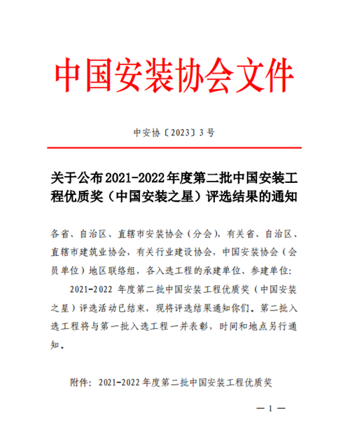 集團公司再創(chuàng)一個國家級安裝工程質(zhì)量最高獎——安裝之星