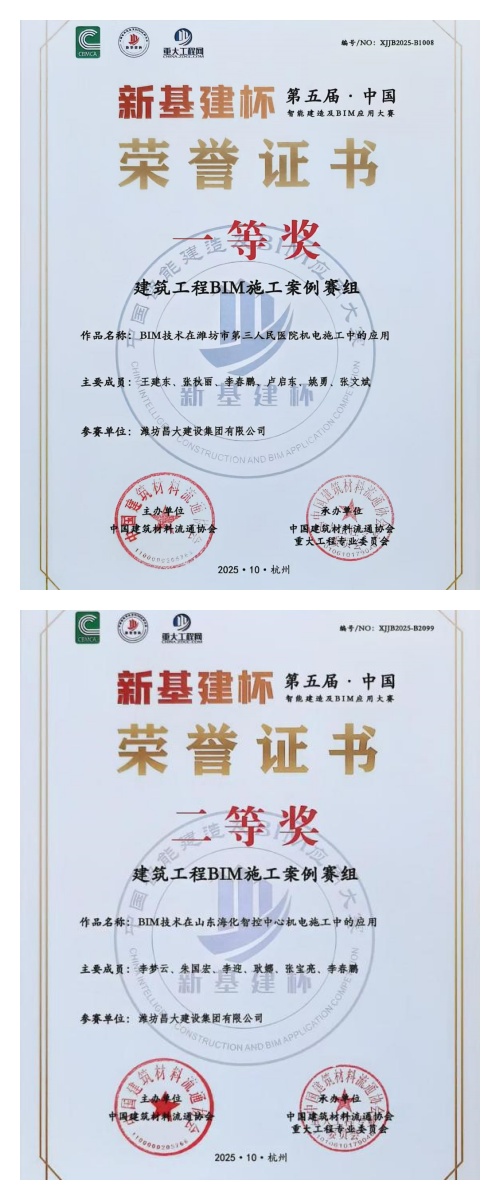 據(jù)悉,本屆大賽采取企業(yè)自愿參賽機(jī)制,經(jīng)過嚴(yán)格的形式審核、在線評審、視頻答辯及結(jié)果公示等環(huán)節(jié),最終確定獲獎成果。其中,由集團(tuán)第二安裝公司申報(bào)的《BIM技術(shù)在濰坊市第三人民醫(yī)院機(jī)電施工中的應(yīng)用》和《BIM技術(shù)在山東?;强刂行臋C(jī)電施工中的應(yīng)用》分別榮獲一等獎和二等獎。